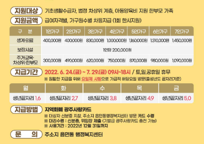 지원금액 : 급여자격별, 가구원수별 차등지급 (1회 한시지원)